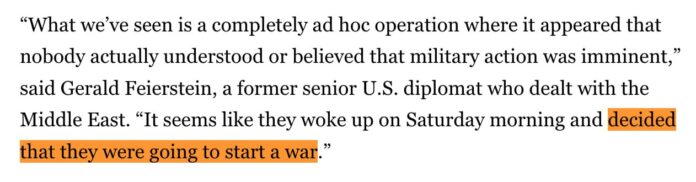 元米国高官(CIA ) のジェラルド・ファイアスタイン氏は、この対応を「完全に場当たり的な作戦だ…まるで目が覚めて戦争を始めようと決めたかのようだ」と評した。