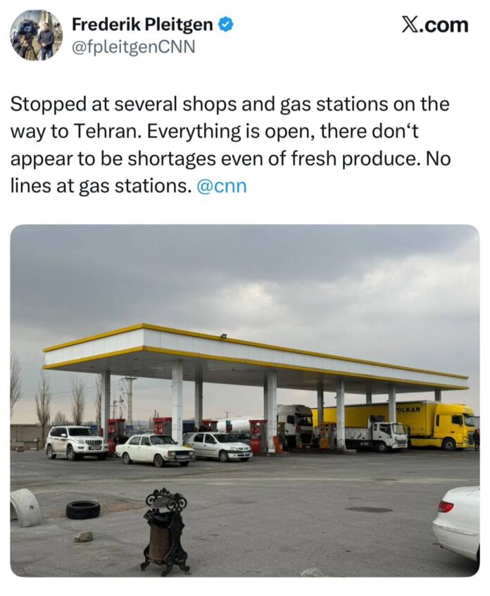 西側諸国のメディア報道は 現実とは正反対だ 。イランの首都テヘランが破壊されているかのように報じている。しかし、実際に現地にいるCNN特派員がXにこう投稿している。「テヘランに向かう途中、いくつかの店とガソリンスタンドに立ち寄った。すべて営業しており、 生鮮食品でさえ品不足は見られない。ガソリンスタンドにも行列はない。」
