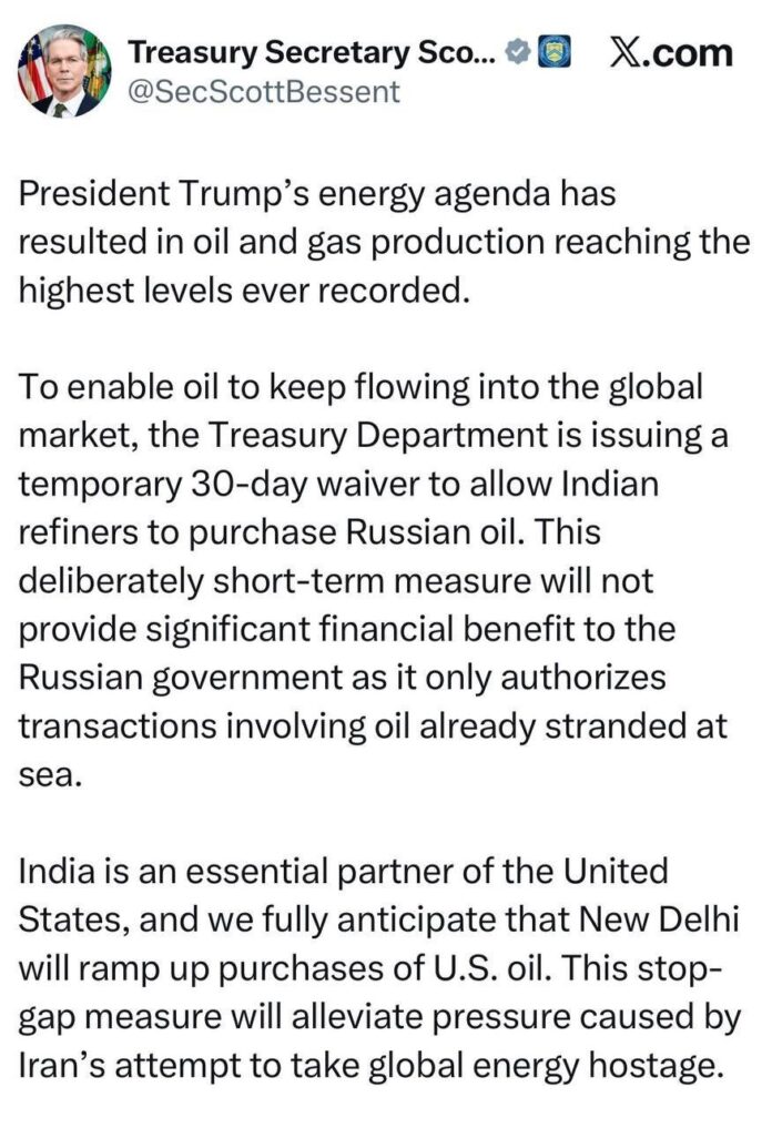 米国はクルド人に関する嘘に加え、インドについても嘘をついている。米国財務省は、インドの精製業者がロシア産原油を購入することを30日間の暫定的な免除措置として認めると発表している(ツイート参照)。しかし、実際には、インドはロシア産原油ではなく自国の原油を購入するという米国の要求を拒否したのだ。つまり、米国は 面目を保つために、インドに許可を与えた か のように装っているのだ。