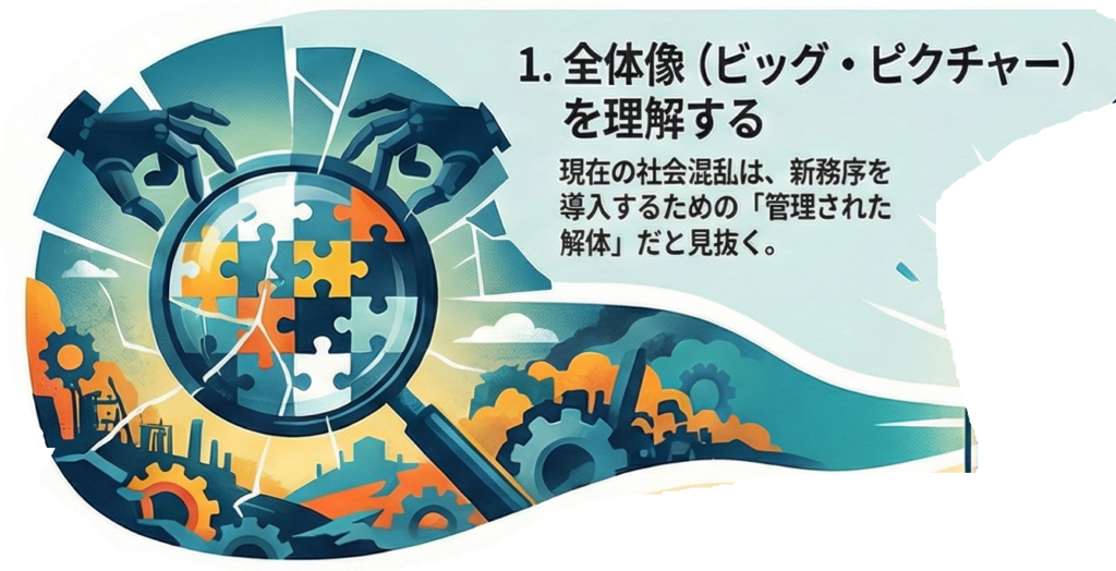 • 戦争や経済崩壊を利用: 過去の世界大戦や大恐慌と同様に、既存の枠組みを壊すことで、より自由を制限した新しいシステムへの置き換えを可能にします。