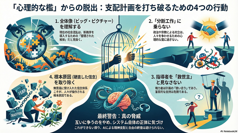 この「グローバル・カルト」による計画を食い止め、被害を最小限にするために人民が取るべき行動は、物理的な抵抗よりも先に、「心理的な檻」からの脱却と、全体像の把握です。