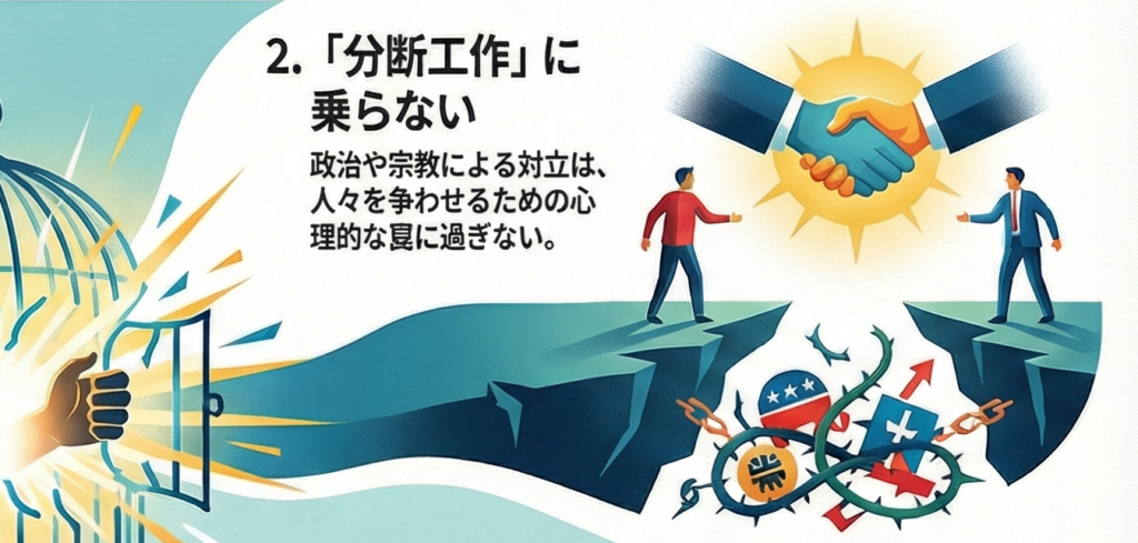 • 政治的・宗教的信念の放棄: 「右派か左派か」といった政治的対立や、宗教的な信念体系に基づく争いは、人々を互いに戦わせるための「マインド・トリック(心理的な罠)」に過ぎません。