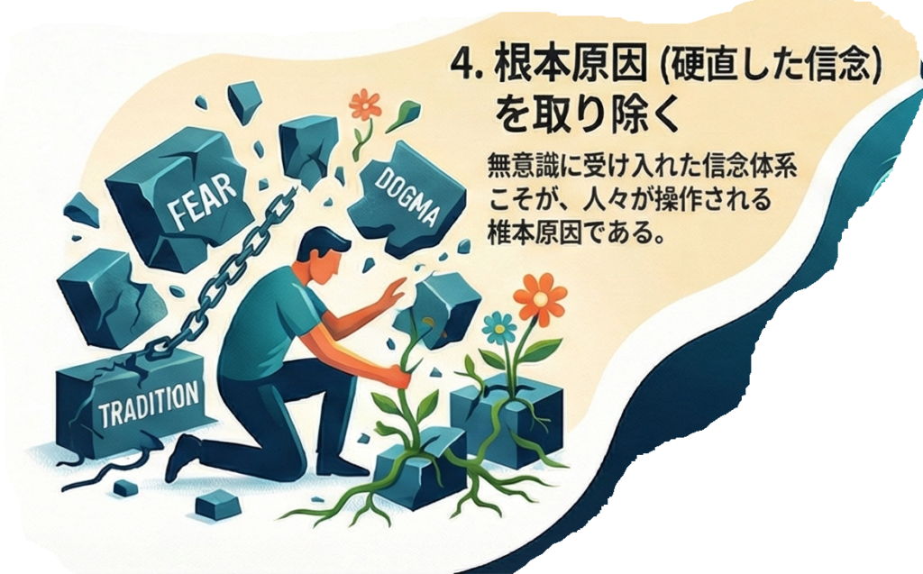• 無意識の信念体系を疑う: 人類は、疑問を持たずに特定の信念体系に従うよう操作されてきました。この「硬直した信念」こそが問題の根本原因であり、それを取り除くことが解決への道です。