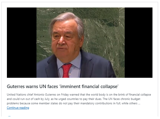 これは米国だけに限った話ではない。だからこそ、「国連事務総長アントニオ・グテーレスは金曜日、国連は財政破綻の瀬戸際にあり、7月までに資金が枯渇する可能性があると警告したのだ。