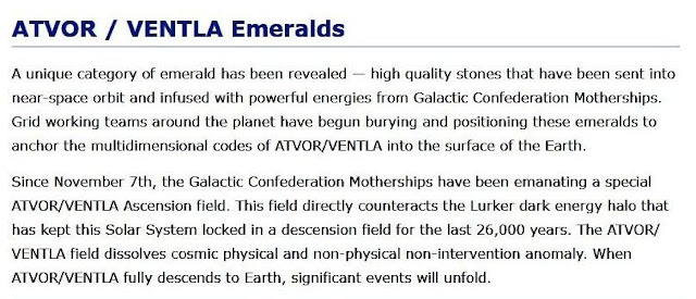 ATVOR/VENTLAエメラルドのネットワークが、惑星地球の光のグリッド内に戦略的に配置されています。ATVOR/VENTLAエメラルドは近宇宙空間に打ち上げられ、そこで銀河連合のマザーシップのエネルギーが注入された石です。ATVOR/VENTLAエメラルドは、新しい天国と新しい地球の間の宇宙の架け橋です。
