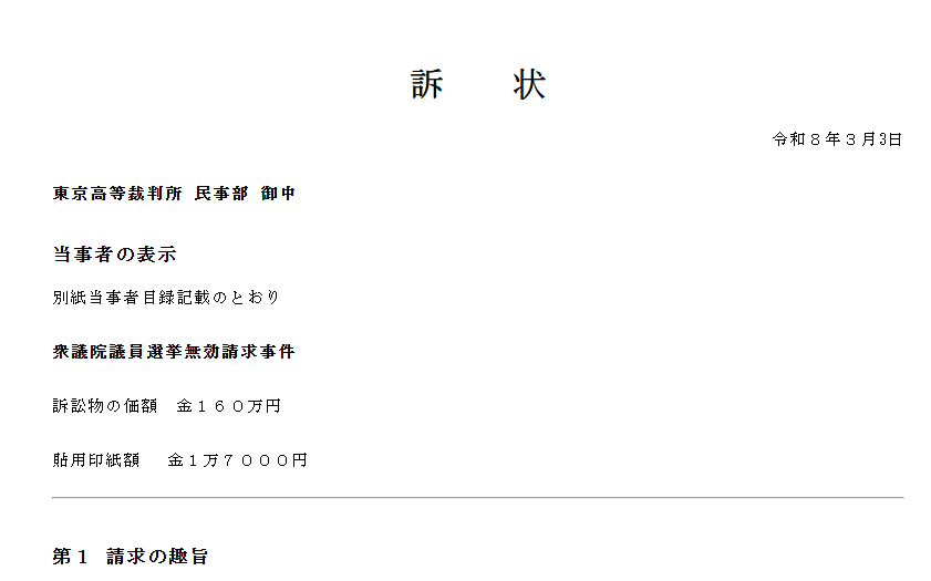 令和8年に行われた衆議院議員総選挙において、東京都第17区および比例代表東京ブロックの選挙無効を求める訴状です。