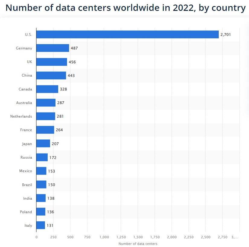 この分野では、米国には強力な競合相手がいません。実際、 Statista.comによると、米国は世界のほぼすべての国 を合わせたよりも多くのデータセンターを所有しています。