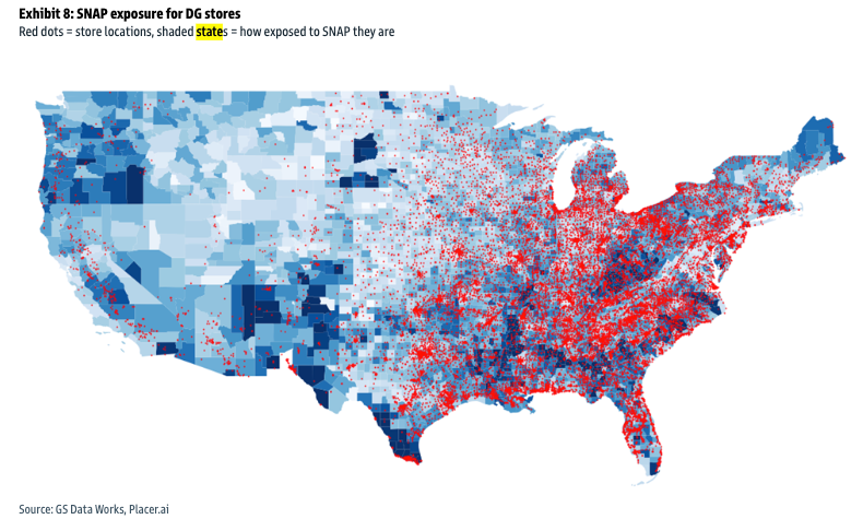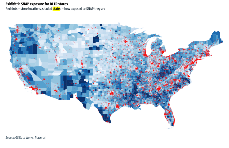 夏にゴールドマンのアナリストの言葉を引用した私たちのメモを思い出してください。ディスカウントチェーンのダラー・ジェネラルとダラー・ツリーの SNAP エクスポージャーは次のとおりです。
