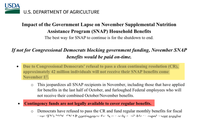 議会民主党がクリーン継続決議(CR)の可決を拒否したため、11月1日にはおよそ4,200万人がSNAP給付金を受け取れなくなる。