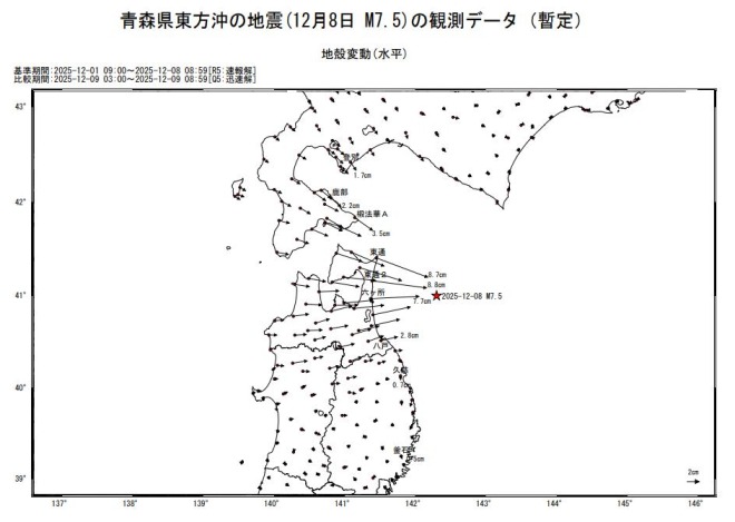 2025年12月8日青森でM7.6地震-大規模な地殻変動、六ヶ所村で約8センチ観測