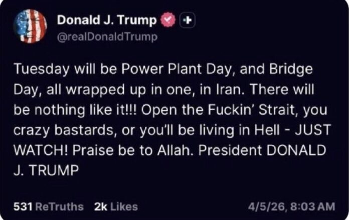 最新の例では、トランプはイランにこう言った。「クソッタレの海峡を開けろ、この狂った野郎ども、さもないと地獄で暮らすことになるぞ…アッラーに栄光あれ。」