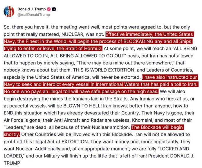 次に「トランプ」は、米海軍に対し、ホルムズ海峡を「出入りしようとするあらゆる船舶」に対して封鎖するよう命じた。さらに、イランに料金を支払った国際水域内のすべての船舶を捜索し、拘束するよう米海軍に指示した。「違法な料金を支払った者は、公海上での安全な航行を許されない」。