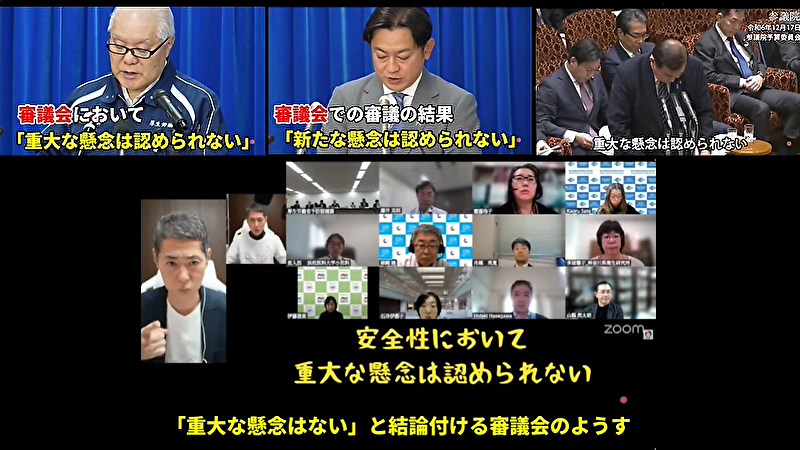 - 審議会では、座長(モデルナなどからコンサルタント料を受けている人物)が「重大な懸念は認められないという評価でよろしいでしょうか」と問いかけ、製薬マネーを受け取る専門家たちが頷く、という形式で安全性が承認されている状況が批判されています。