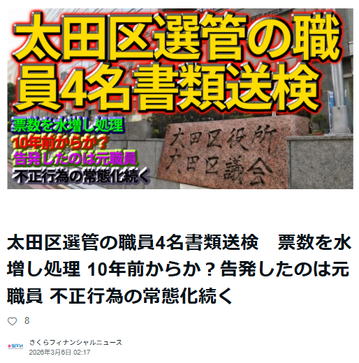 事態を重く見た見波さんは、区ホームページなどで公表されている開票結果で、不在者投票数がこれまでの倍以上に増えていることを確認。「大田区さんやらかしてませんか」「白票の水増しやってませんか」とX(旧ツイッター)で投稿し、投稿サイト「note」でも詳細な経緯を記した。