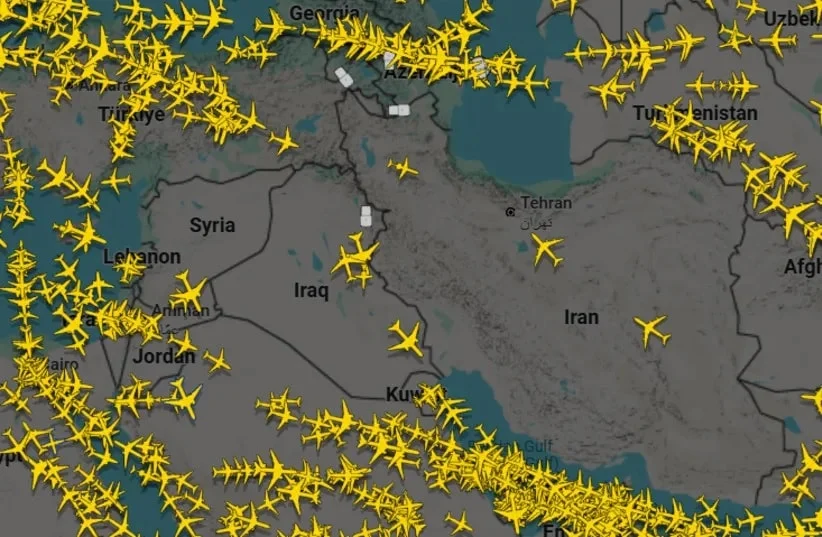 Flightradar24.com のスクリーンショットには、2025 年 1 月 15 日、イランとイラク上空の空域から徐々に航空機が消えていく様子が写っている。