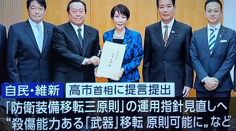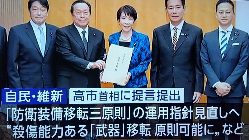 自民党と日本維新の会の安全保障調査会は6日、防衛装備品の輸出ルール緩和を高市早苗首相に提言した。輸出を非戦闘目的に限定する「5類型」を撤廃し、戦闘機や護衛艦など殺傷・破壊能力を持つ武器の輸出を原則容認する内容が柱で、戦闘中の国への輸出も例外的に認める余地を残した。政府は提言を基に今春にも防衛装備移転三原則の運用指針を改定する。