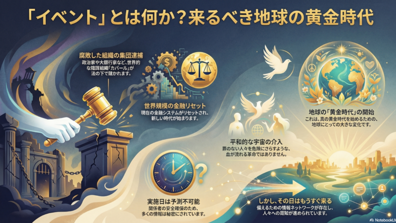 「イベント」とは、世界規模の金融リセットとともに、腐敗した政治家・大銀行家など、世界規模の陰謀組織であるカバールを法の下で集団逮捕する日のことです。それは、三次元的な地球革命ではなく、地球の黄金時代を真に開始するための変化の始まりです。罪のない人々の命を危険にさらすような三次元的地球型革命ではありません。古い三次元の現実から新しい世界へと平和的に移行するための宇宙の介入そのものです。