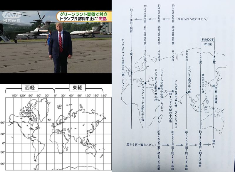 デンマークの領地であるグリーンランドをトランプが買収しようとしています。調べるとトルーマン大統領も同じことを画策していました。なぜでしょうか?実はロンドンの次に西の闇が拠点とする西経22.5度にある陸地は、グリーンランドしかないのです。つまり、800年後の覇権争い、陣取り合戦がすでに始まっている、ということです。凍てついたグリーンランドの厚い氷河が融けてきているのは報道の通りです。ご察しの通り、「地球温暖化」とは、グリーンランドを次の本拠地にするための動きに過ぎません。