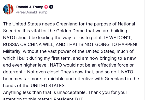 トランプ氏とその同盟国が現在主張しているのは、アメリカがグリーンランドを占領しなければ、中国かロシアが占領する可能性があるというものだ。「もしアメリカが占領しなければ、ロシアか中国が占領するだろう。だが、そんなことは起きない!」とトランプ氏はTruth Socialに書いた。