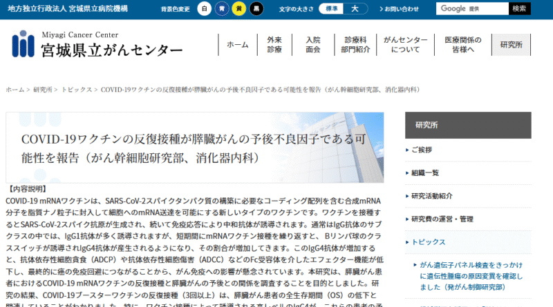 COVID-19ワクチンの反復接種が膵臓がんの予後不良因子である可能性を報告(宮城県立がんセンター)
