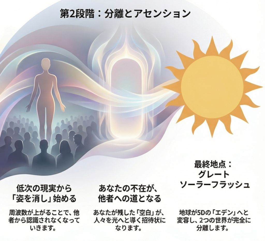 太陽から放たれる「グレート・ソーラー・フラッシュ」によって移行が完了する際、現実は完全に二つの領域へと分離します。
