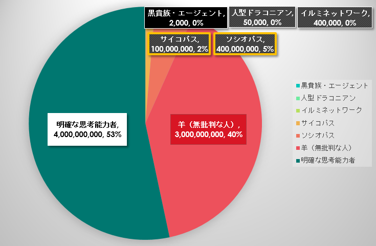 黒い貴族のメンバーと彼らのイエズス会のエージェントは合わせて約2,000人です。彼らの下には、政治家、実業家、弁護士、医者として1996年以降、地球に潜入してきた、人間型クローンの体を持つ約50,000人のドラコニアンがいます:それに続いて、イルミナティネットワークのメンバーが約40万人おり、彼らは自発的にそのネットワークに参加しています。そして、約200万人のメンバーはそのネットワークに強制的に参加させられました。このネットワークは「死の兄弟団」もしくは「死のブラザーフッド」とも呼ばれており、それは新たなメンバーが入団儀式のために人を殺す必要があるからです。それから、特定の状況下でかなり危険になりうる可能性がある精神病患者(サイコパス)が約1億人います。例えば、これらのコロナ担当医師や看護師のような:それに続いて、共感能力が欠如している約4億人の社会病質者(ソシオパス)がいます。そして、批判的思考の能力を持たない、社会のトレンドにただ従う約30億人の「羊(シープル)」(無批判な人々)がいます。そして最後に、少なくともある程度までは明確な思考能力を持つ約40億人の人々がおり、彼らが人類の希望となっています。