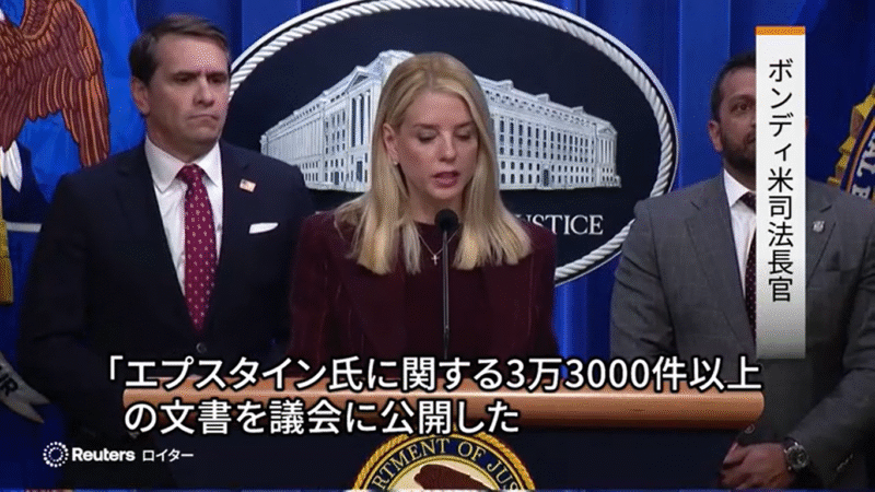 ボンディ米司法長官 「エプスタイン氏に関する3万3000件以上の文書を議会に公開した。今後も法を遵守し、最大限の透明性を確保する。また、全ての被害者の方々に名乗り出るよう勧める」
