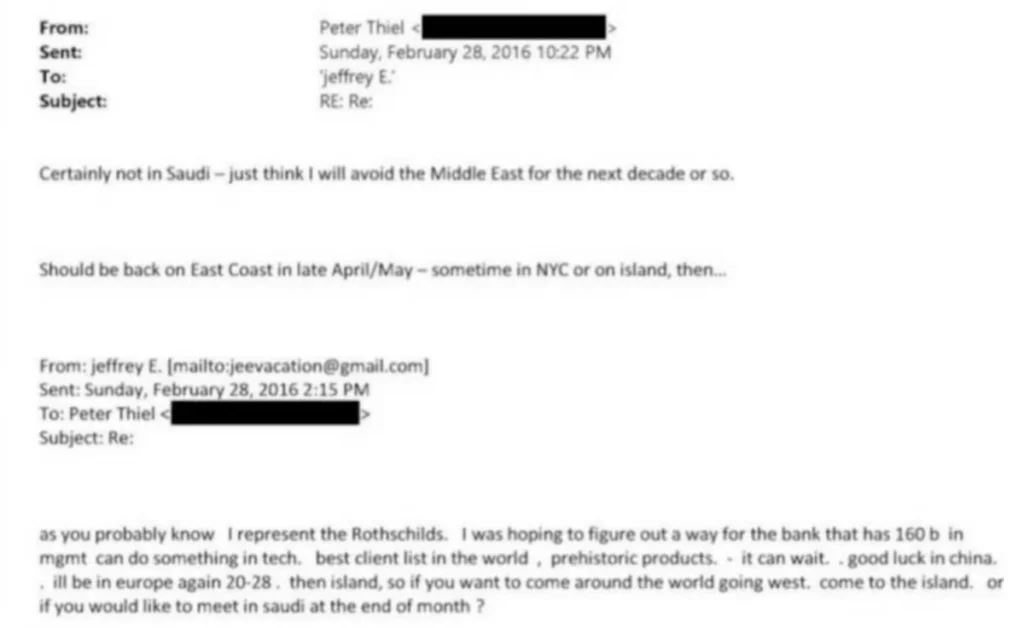 しかし今回は何かが違う。エプスタインのファイル公開により、身を隠していた実力者たちが明るみに出ている。例えば、このメールの中でエプスタインはパランティアのピーター・ティールにこう告げている。「ご存知の通り、私はロスチャイルド家の代理人です」