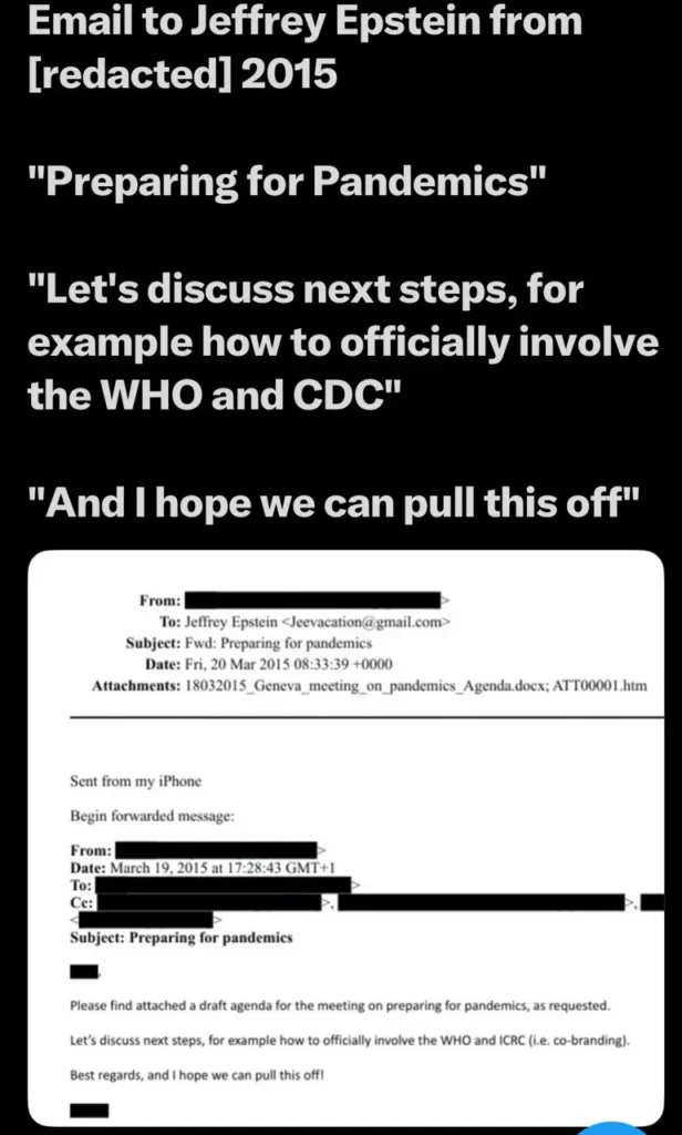 2015年の「パンデミックへの備え」:「例えば、WHOとCDCを正式にどのように関与させることができるかなど、次のステップについて話し合いましょう」「成功することを願っています」。ゲイツは2015年にエプスタイン、WHO、CDCと共にこの詐欺を計画した。彼が「ワクチン」で莫大な利益を得たのも不思議ではない。