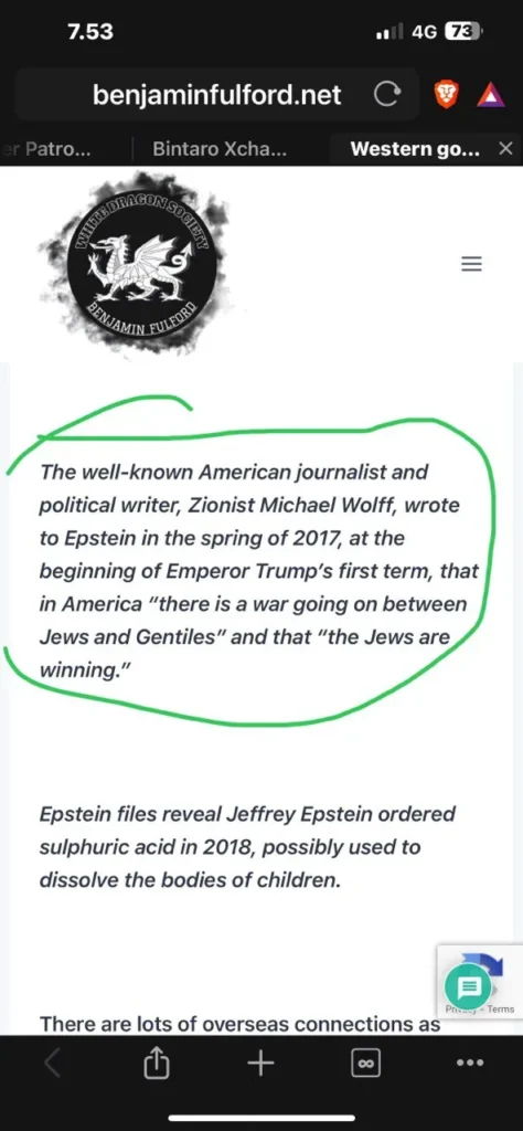 アメリカの著名なジャーナリストで政治評論家、シオニストのマイケル・ウルフは、トランプ大統領の最初の任期が始まった2017年春、アメリカでは「ユダヤ人と非ユダヤ人の間に戦争」があり、「ユダヤ人が勝っている」とエプスタインに手紙を書いた。